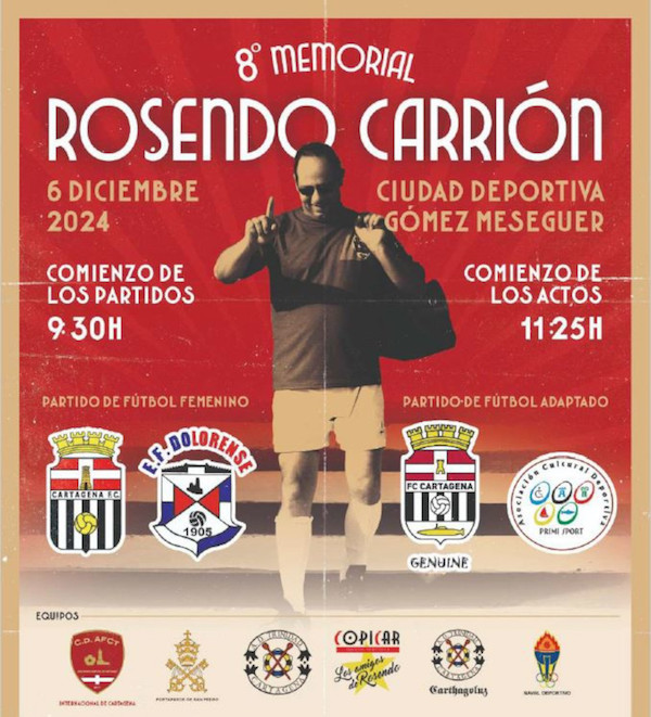 Las instalaciones de la Ciudad Deportiva Gómez Meseguer serán escenario este viernes 6 de diciembre, festivo del Día de la Constitución, del 8º Memorial de fútbol ‘Rosendo Carrión’. A partir de las 9:30 horas comenzarán los encuentros de fútbol masculino, femenino y adaptado, que se disputarán en los dos campos del complejo deportivo de Cabezo Beaza, a lo largo de toda la mañana. La entrega de trofeos está prevista para las 14:15 horas.