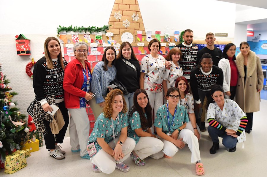 El FC Cartagena ha realizado una entrañable visita de varios jugadores y jugadoras del primer equipo al área de Pediatría del hospital de Santa Lucía. Cedric, Jorge More y Verdú, junto con las jugadoras Aitana, Desi y Carla, acompañados por Marina Rodríguez (gabinete de dirección), ha llevado en estas fechas navideñas ilusión y sonrisas a los niños ingresados en la planta infantil.
