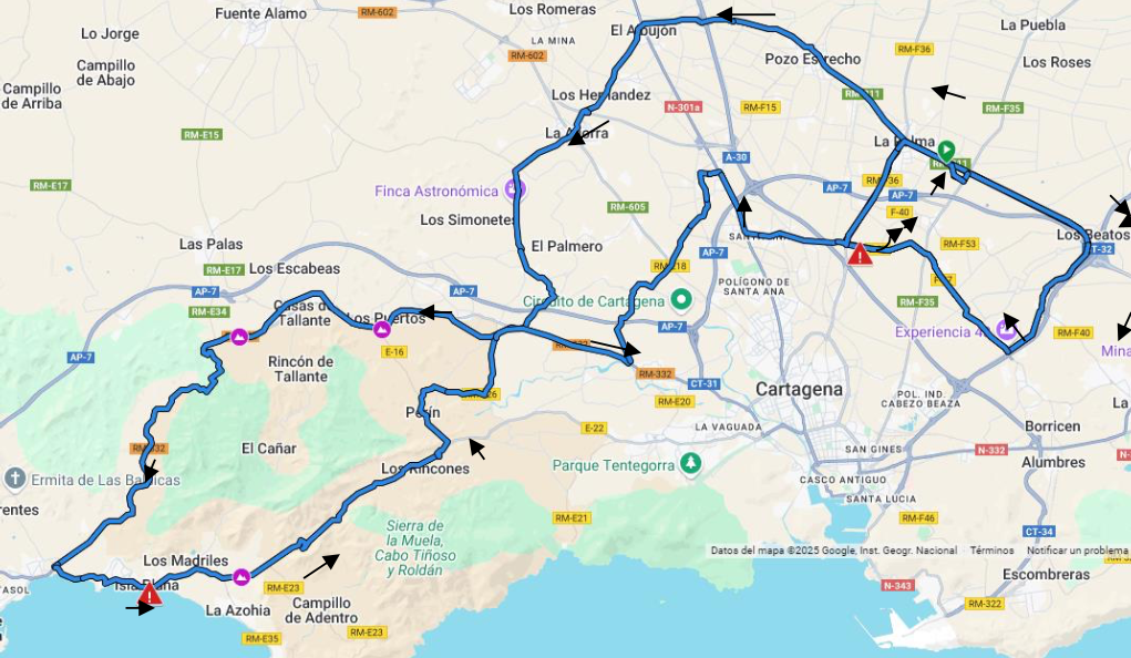 Tras salir de Héroes de Cavite los ciclistas circularán por calle Real, plaza de España, Alameda de San Antón, Escudo, Avenida de Colón en San Antón, Avenida de Juan Carlos I en Media Sala, calle Suspiro y Avenida San Juan Bosco de Los Dolores, La Guía y La Aljorra. Pasará por la puerta del colegio Salesianos a la hora de la salida de los alumnos del centro, lo cual podrá ralentizar la salida de vehículos de la zona.