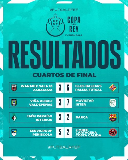 La Copa de S.M. el Rey nunca deja indiferente a nadie y en los cuartos de final disputados se vivieron situaciones de todos los colores: goleadas, remontadas y prórrogas que se decidieron en el último minuto. Los afortunados fueron el Illes Balears Palma Futsal, el Movistar Inter, el Jaén Paraíso Interior y el Servigroup Peñíscola, todos ellos ya saben lo que es saborear una Final Four del torneo y prometen estar presentes en una de las más competidas de siempre. Por contra, el Wanapix Sala 10 Zaragoza, el Viña Albali Valdepeñas. El Barça y el Jimbee Cartagena Costa Cálida se despidieron con honor después de darlo todo.