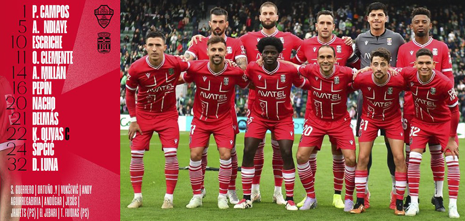 ELCHE CF. Dituro; Álvaro Núñez, Affengruber (Diaby, minuto 58), Bigas, Salinas; Mendoza (Nico Castro, 72), Marc Aguado (Josan, 58), Febas, Germán Valera (Jairo, 87); Agustín Álvarez (Óscar Plano, 72) y Mourad.