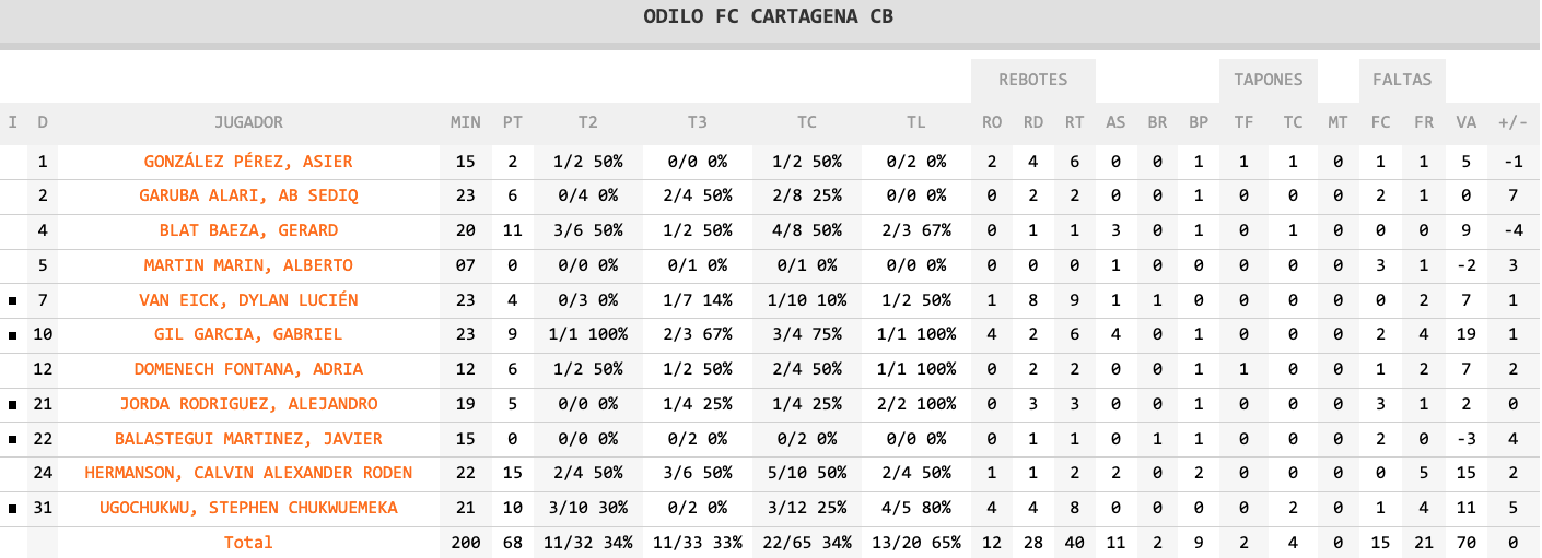 El encuentro comenzó a las seis de la tarde y bien pudo pensarse que prolongar la siesta pudo haberle salido caro al Odilo Cebé, pues tardó mucho en entrar en el partido, como refleja que ya tenía una desventaja de 14 puntos en el primer cuarto (16-2) y que en el tercero llegó a ser de 15 (48-33). Sin embargo, ahí despertó y firmó un parcial de 5-23 que lo puso por delante en el marcador al poco de entrar en el cuarto decisivo (53-56). Entonces, el equipo sevillano volvió a cargar las pilas y el tanteo estuvo entre uno y cuatro puntos hasta el 64-65, ampliándose a la diferencia de 4 tantos final, que fue la máxima favorable de los cartageneros en la cancha de un colista que llegada tras dos victorias seguidas, mientas que los de Jordi Juste precisaban volver a la senda de los triunfos tras otras tantas sin ganar. Lo mejor, sin duda, fue la victoria y seguir en plaza de fase de ascenso. En la estadística se observa que el Odilo fue mejor en rebotes y triples, pero su efectivo en el resto de lanzamiento fue inferior a los sevillanos.