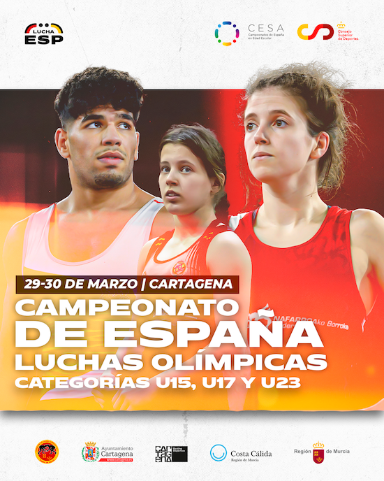 La ciudad de Cartagena será sede, los días 29 y 30 de marzo, de los Campeonatos de España en Edad Escolar (CESA) de Luchas Olímpicas para categorías U15 y U17 y el Campeonato de España de Luchas Olímpicas de categoría U23, la antesala al senior. El evento, dentro de la estrategia “Cartagena Destino Deportivo” se celebrará en el Pabellón Central (Wssell de Guimbarda), está organizado por la Federación Española de Lucha y la territorial murciana, con la colaboración del CSD, el Ayuntamiento de Cartagena y la Comunidad Autónoma de la Región de Murcia.