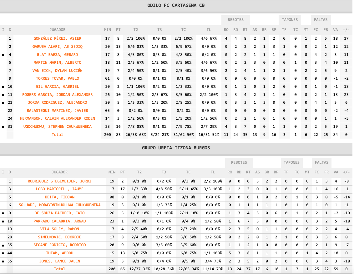 Odilo FC Cartagena CB desbanca al Tizona Burgos de la séptima plaza en un partido que comenzó con malos principios locales y recital visitante (16-29), para en el segundo cuarto igualarse y quedar sentenciado al acabar el tercero merced a un conjunto cartagenero que, pese a los fallos en el tiro libre, fue a más mientras que los burgaleses se iban quedando sin 'filo'. Ahora, disputar la fase de ascenso a la ACB está muy a tiro, pues podría bastar con una victoria más.