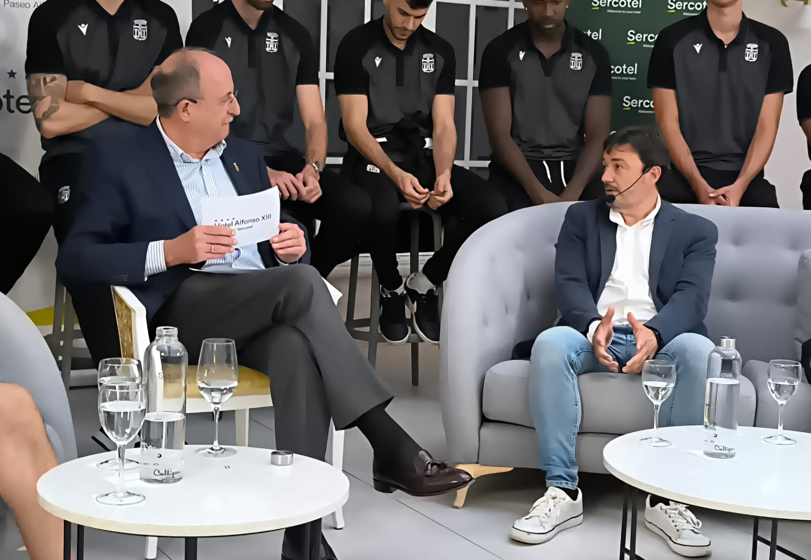 El presidente, cuerpo técnico y jugadores del equipo de baloncesto de Primera FEB de Cartagena estuvo en la tertulia del hotel Alfonso XIII se mostró optimista de cara a la fase de ascenso y, respecto al futuro siguiente, hizo un llamamiento tanto a la afición como al tejido empresarial y social.