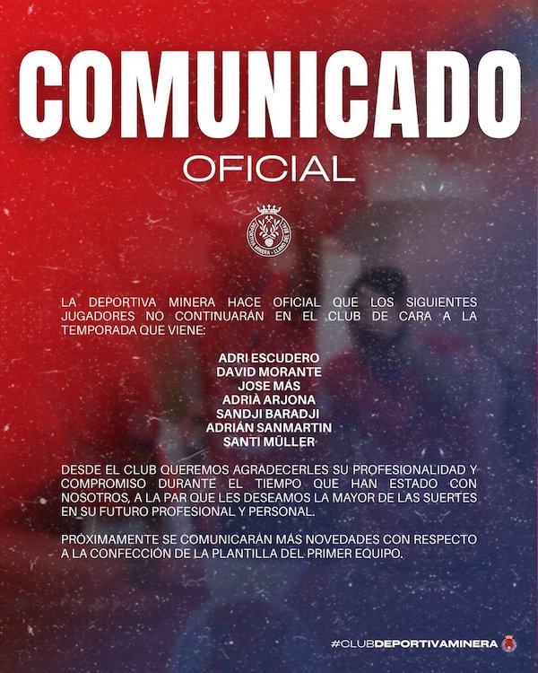 El club de El Llano del Beal hace oficial una lista de siete futbolistas que, al igual que el entrenador, Pepe Aguilar, no seguirán la próxima temporada con el equipo minero de Segunda RFEF. Por contra, ha renovado Rubén Mesa (autor de 7 goles esta reciente temporada) y ha fichado para dos campañas como preparador del equipo a José Carlos Romero 'Checa' Checa, procedente del Xerez CD.