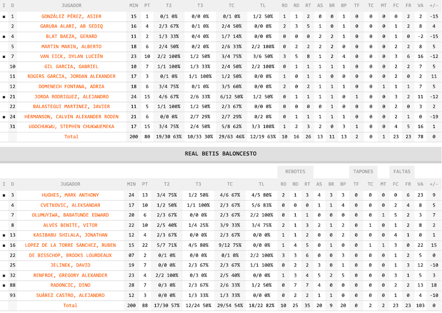 El Real Betis había anotado 29 puntos en el primer cuarto, cifra muy alta y que, como cabía esperar, no pudo mantener. Además, en el segundo cuarto se estrenaron los locales Álex Jordá y Van Eick, quienes en el tercer asalto del viernes no habían anotado punto alguno, lo que era un buen dato.