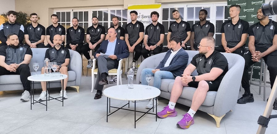 El presidente, cuerpo técnico y jugadores del equipo de baloncesto de Primera FEB de Cartagena estuvo en la tertulia del hotel Alfonso XIII se mostró optimista de cara a la fase de ascenso y, respecto al futuro siguiente, hizo un llamamiento tanto a la afición como al tejido empresarial y social.