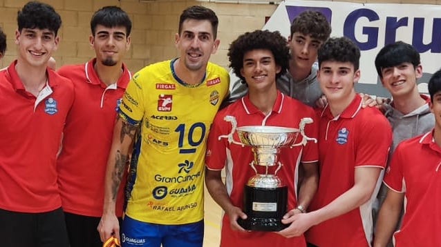 El cartagenero ha logrado con el CV Guaguas de Las Palmas su tercer título de esta temporada al conseguir este pasado fin de semana el campeonato de liga de la máxima categoría del voleibol español tras imponerse al Río Duero Soria por 3-0. En su trayectoria, ya luce 19 títulos a nivel de equipos y más de medio centenar de convocatorias con la selección española. Es el capitán de un equipo donde milita desde 2020 y en la fotografía adjunta se le observa con elástica amarilla con el equipo juvenil del CVP Cartagena, club donde se formó.