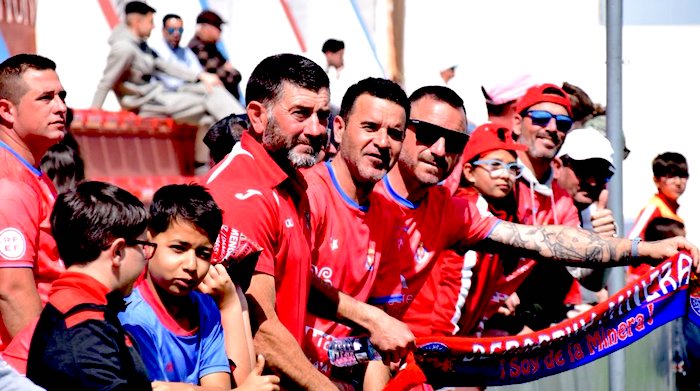 Arjona, Rubén Mesa y Britos firman la victoria sobre el Xerez Deportivo y el equipo de El Llano del Beal esquiva las plazas de descenso directo, quedando como único riesgo el puesto de promoción, pero lleva una ventaja de 7 puntos más el 'average' cuando sólo quedan 9 en juego. En la foto, aficionados en un domingo donde se llenó el estadio de público