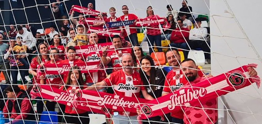 Un gol en el último suspiro de Mouhoudine da la victoria al Jimbee FS Cartagena, que vuelve a saborear una victoria después de ocho jornadas sin hacerlo (desde el 25 de enero), lo que le permite salvaguardar la quinta posición en la clasificación y acercarse a 8 puntos de la cuarta. En la foto, aficionados cartageneros desplazados a la pista del Manzanares.