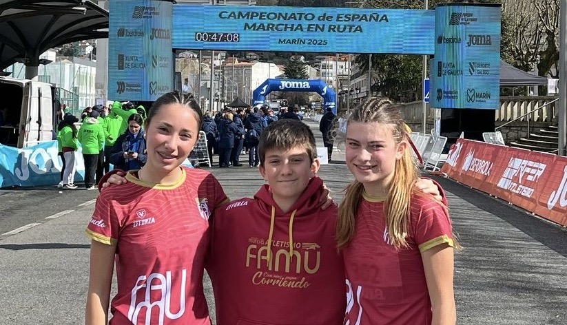 El equipo cartagenero ha brillado en un fin de semana repleto de actividades, destacando un cuarto puesto de Andre Rico en el Nacional sub-20 de lanzamiento de peso, varios podios en los regionales de sub-10 y sub-12 y los dos primeros puestos conseguidos por Víctor Requena y Otmane Raougui en la cuarta edición de carrera 'Animal' de Los Alcázares. En la foto, Óscar Mateo, Nerea Díaz y Elena García, quienes compitieron con el equipo autonómico en el Nacional sub-16 de marcha celebrado en Pontevedra