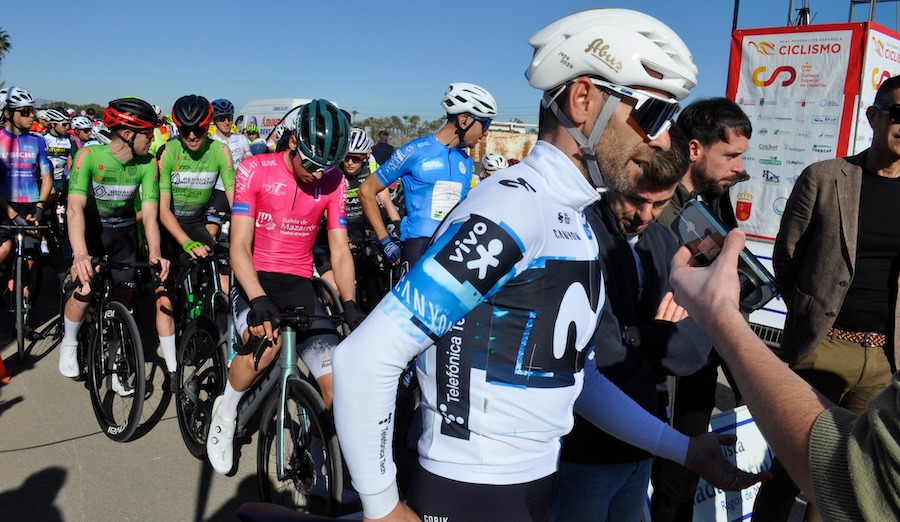 La segunda etapa de la 'VIII Vuelta al Guadalentín', con salida y meta en La Palma, se resolvió al esprint con victoria de José María Martín sobre Pedro Lozano y Pedro Ortega, siendo los tres parte de los siete corredores que ocupan el liderato de la general con el mismo tiempo antes de la etapa final de hoy en Lorca. En la foto, Alejandro Valverde, histórico del ciclismo regional y nuevo seleccionador nacional, ayer en tierra palmesana.