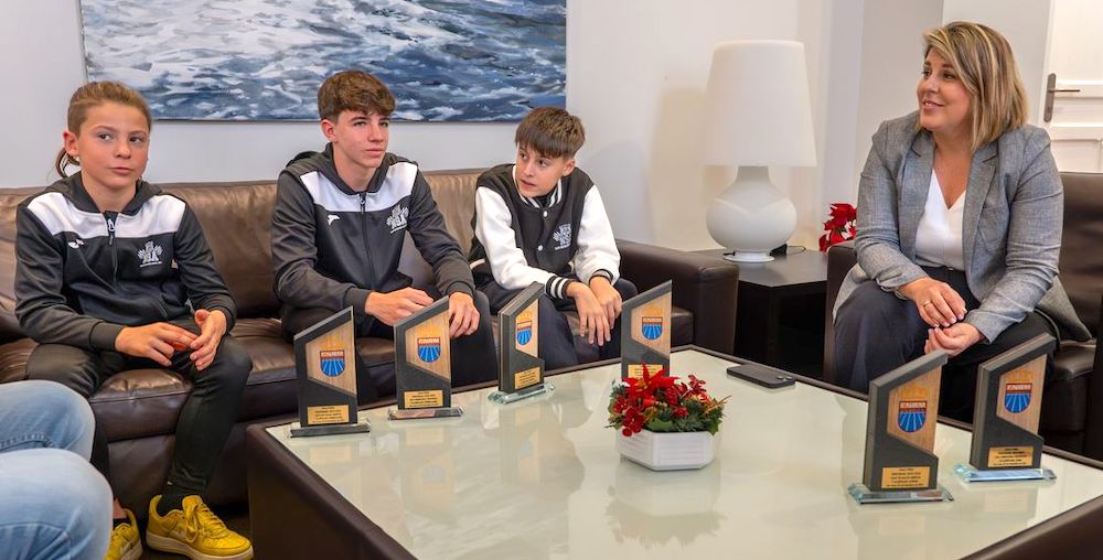 La alcaldesa de Cartagena ha recibido y felicitado a los jóvenes campeones regionales de la liga de piscina y aguas abiertas. Hugo Martínez, Elías Vázquez, María Albaladejo y el más pequeño, Hugo García cierran un año brillante por sus éxitos.