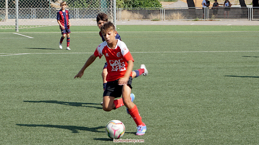 Ha comenzado la celebración de la tercera edición del torneo 'Sirenas Cup', que se celebra en los campos de fútbol de La Unión y de Los Alcázares, siendo ocho hoteles de La Manga los que acogen a jugadores y familiares. En el torneo benjamín que se ha iniciado esta mañana participan equipos cartageneros FC Cartagena A y B y Cartagena Promesas. La foto corresponde a un lance de este último equipo frente al Levante UD.