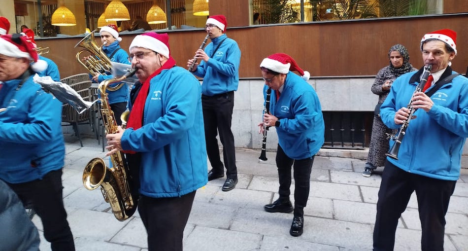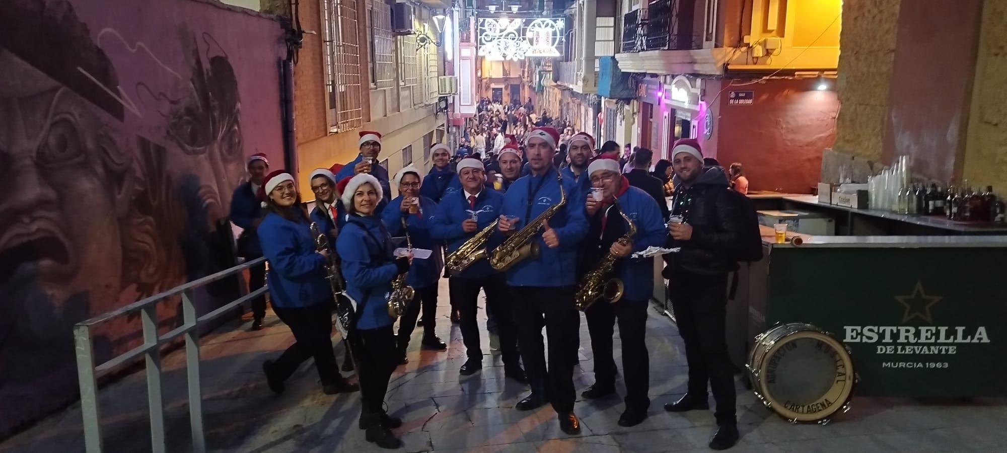 La animada canción de 'La Pegatina' no faltó (entre otras muchas de gran popularidad y ritmo) en la pachanguera ruta que la Asociación Músico-Cultural 'Cartagena 1990' llevó a cabo por el centro histórico de la ciudad en una 'Tardevieja' que recuperó ambiente cuando se alejaron las nubes que rompieron los planes matinales del último día del año 2024.