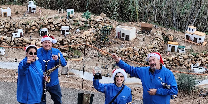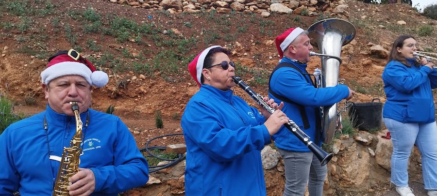Imágenes del nacimiento más campero de Cartagena coincidiendo con el paso de la charanga navideña de la Asociación Músico-Cultural 'Cartagena 1990'.