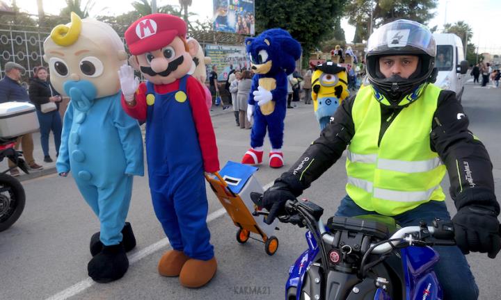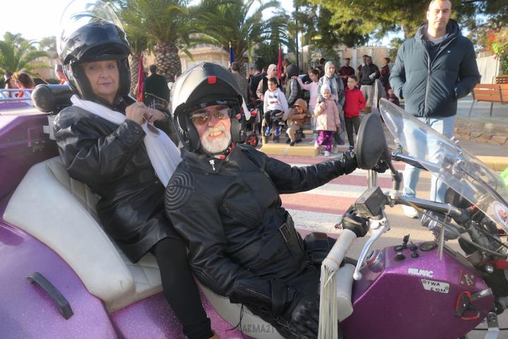 Con los grupos formados dentro del recinto de Salesianos, la cabalgata se uso en marcha con puntualidad (cinco de la tarde) tras una cuenta atrás que culminó la sirena de un coche patrulla de la Policía Local. En cabeza iban integrantes del Motoclub Cartagena, que este año cumple 70 años de andadura.