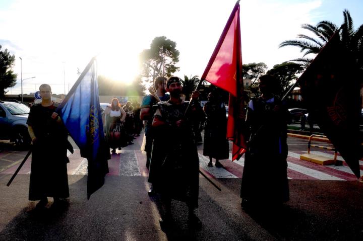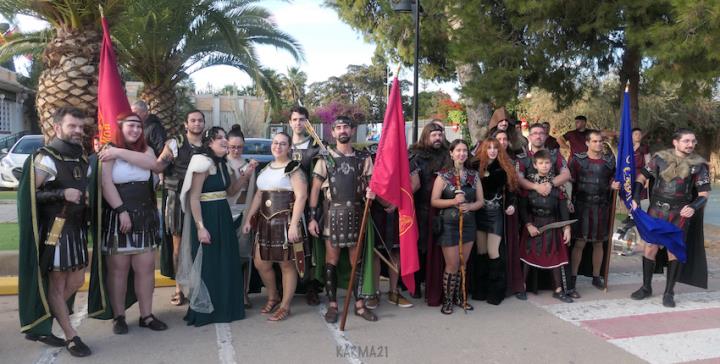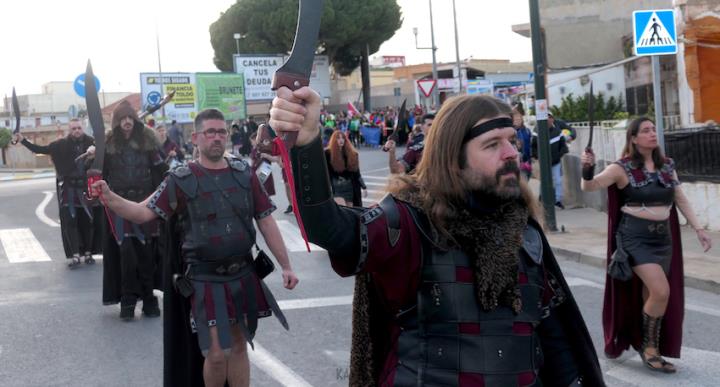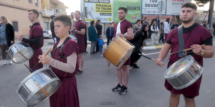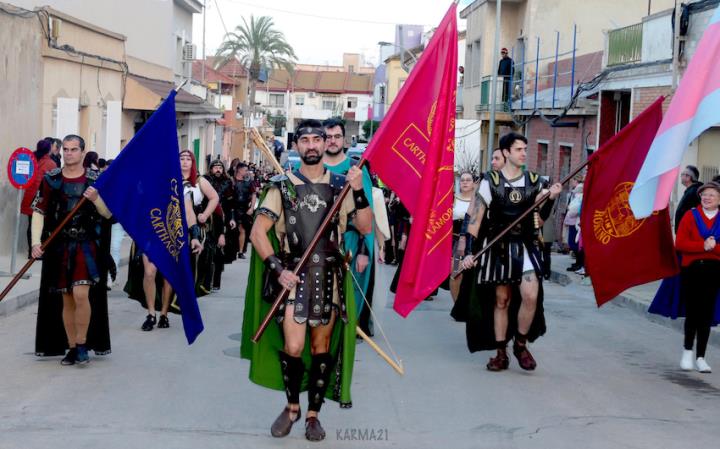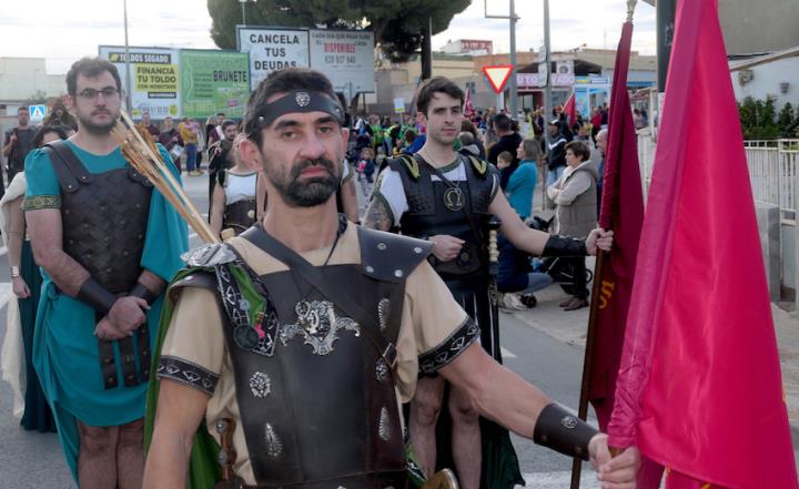 Una escuadra de carthagineses (tropas de Quart-Hadast e Himilcón) y romanos (Adoradores de Venus y Magistrados) iba a continuación de forma marcial al ritmo de su grupo de tambores. Los grupos más numerosos eran los que formaban las AMPAs de los colegios Sagrado Corazón de Jesús (Las Monjas) y Juan Solé (Salesianos).