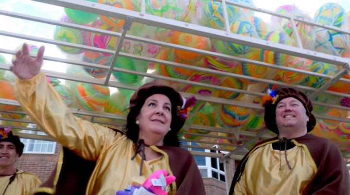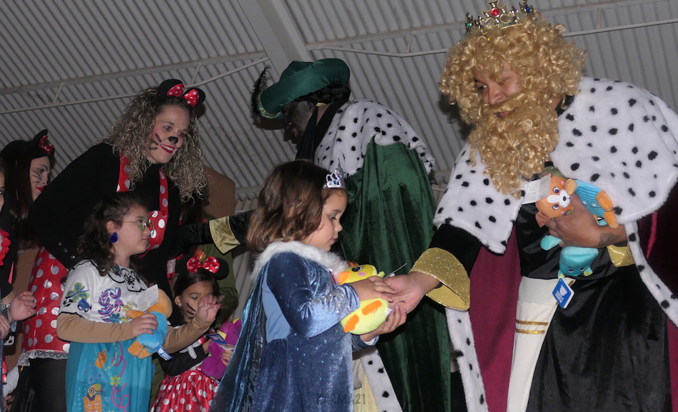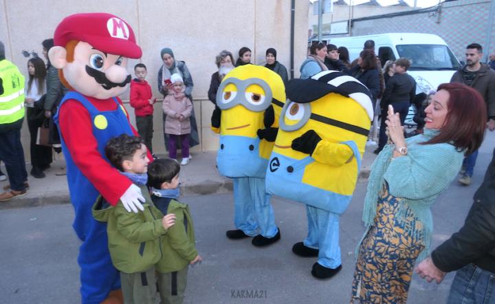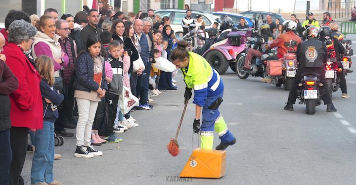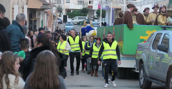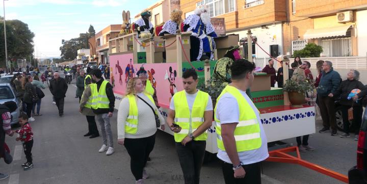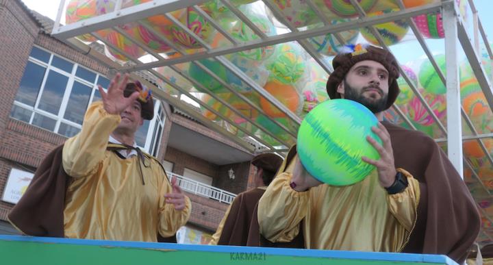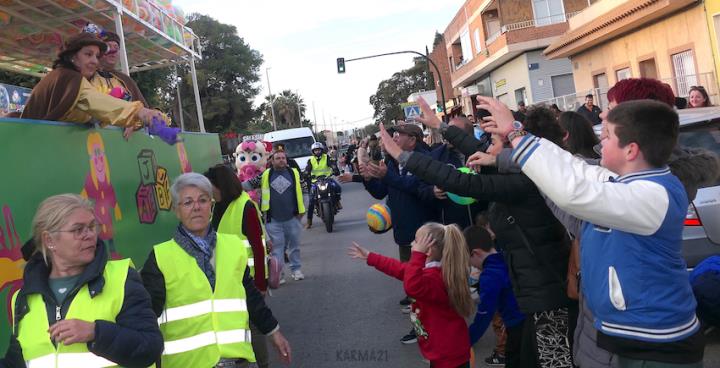 Y llegaron las carrozas. En la primera iban componentes de la Junta Vecinal (vocales de PP, VOX, MC y PSOE) como pajes reales, quienes lanzaron un millar de balones y otro de muñecos. A pie, a continuación, muñecos de populares personajes (numerosos espectadores se fotografiaron con ellos) que llevaban el buzón real para los niños que quería depositar sus cartas. Cerró la carroza de Melchor, Gaspar y Baltasar, desde donde se lanzaban caramelos.