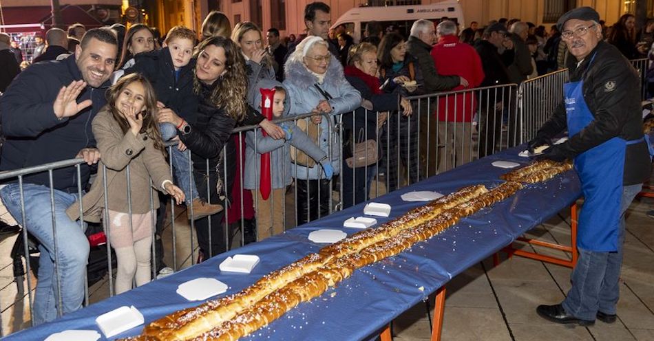 Ayuntamiento y Cope se pusieron el delantal para repartir miles de raciones del roscón de reyes, elaborado por artesanos locales, a las puertas del Palacio Consistorial.
