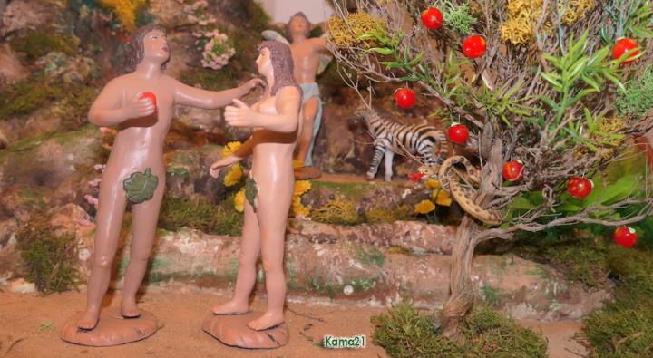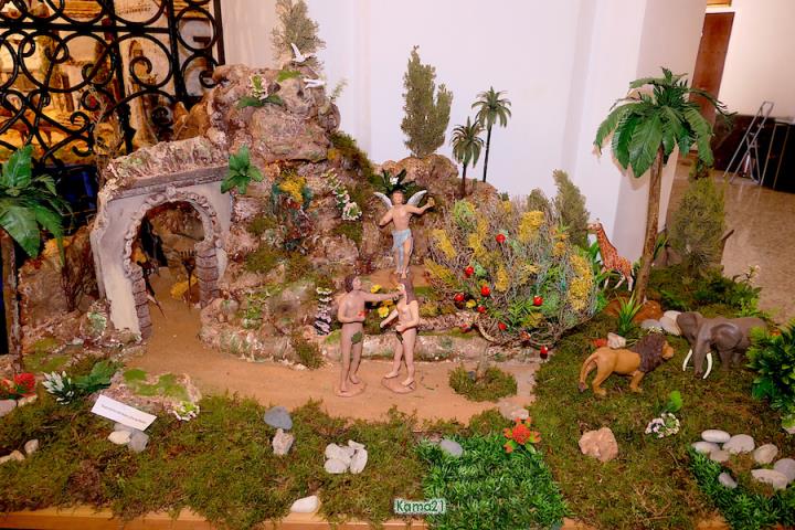 El belén de la parroquia de San Antonio Abad ha incluido la presencia de Adán, Eva y la serpiente en una extensión lateral del gran montaje, además de lucir una réplica de la iglesia de la villa que desde este año permite visionar su interior desde la pequeña puerta.