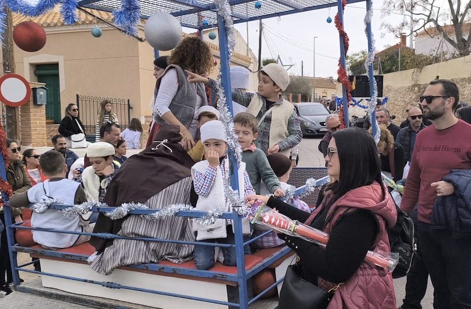 La cabalgata salió a las once de la mañana desde la Asociación de Vecinos con dos carrozas. Una, con Melchor, Gaspar y Baltasar y, otra, con madres y niños vestidos de pastorcillos.