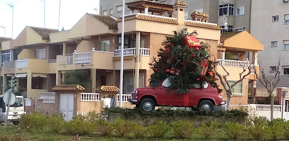 El turismo situado en la redonda de acceso a la Barriada Virgen de la Caridad ('Las Seiscientas') en homenaje al popular coche del pasado siglo está a tope de cajas de regalos estos días sobre su baca.