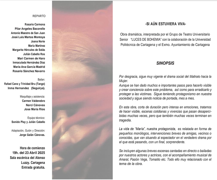 Carmen Valdenebro, una de las alumnas, expuso en la presentación de la obra, que haberse matriculado en la universidad de mayores de la UPCT había supuesto, además de "disfrutar aprendiendo", que emergiesen en ellos "cosas que teníamos escondidas", en referencia a la vena interpretativa. A partir de ahí, bajo la dirección de Jorge Galán Cánovas, se formó el grupo de teatro sénior 'Luces de Bohemia' con matriculados de primer curso, cuya puesta de largo ha sido con la trágica 'Si aún estuviera viva', cuyo guión fue escrito por el propio director, a quien se observa bajo estas líneas.