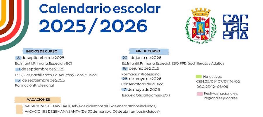 El nuevo curso comenzará el 8 de septiembre en Infantil, Primaria, Especial y EOI; el día 11 en ESO, FPB, Bachillerato, Adultos y Conservatorio de Música; y el día 15 en Formación Profesional. También se recogen los días no lectivos y los festivos.