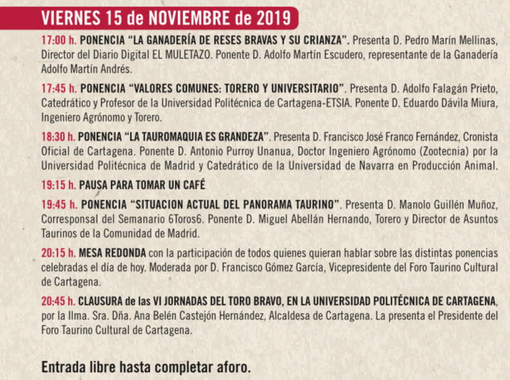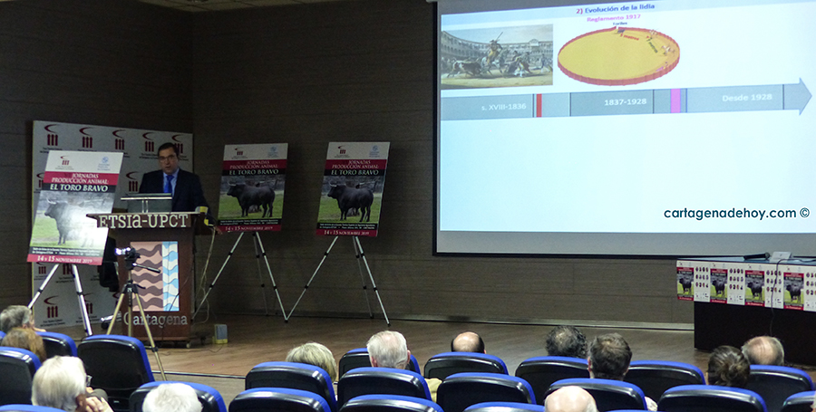 El salón de actos de la Escuela Técnica Superior de Ingeniería Agronómica del paseo de Alfonso XIII de Cartagena acogió ayer la primera de las dos jornadas científicas que giran en torno al toro bravo, en una iniciativa bianual que organizan Foro Taurino Cultural de Cartagena y Comarca y la Universidad Politécnica de Cartagena.