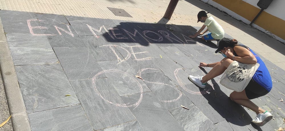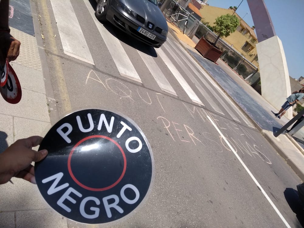 Tras denunciar, mediante una pequeña performance, la eliminación del paso de peatones situado frente al Hospital Perpetuo de Socorro, la marcha siguió su recorrido hacia la Alameda de San Antón, para seguir denunciando la falta de pasos de peatones, así como la falta de espacio en las aceras debido a la invasión incontrolada de las terrazas de bares y cafeterías.