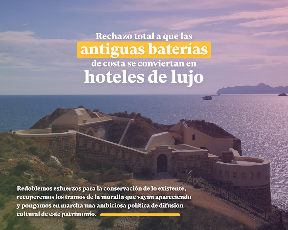 “Las últimas noticias aparecidas en la prensa regional hablan de contactos por parte del Ayuntamiento con el Ministerio de Defensa, con Paradores Turísticos de España y con inversores privados para recuperar las ruinosas baterías y darles un uso turístico. Nos preocupa que este consistorio decida acordar la cesión de las baterías de costa con el Ministerio de Defensa para posteriormente malvenderlas o entregar su aprovechamiento a la iniciativa privada de manera que la riqueza patrimonial de nuestro municipio se aleje, una vez más, del uso y disfrute público de la ciudadanía cartagenera”, ha concluido Aroha Nicolás.