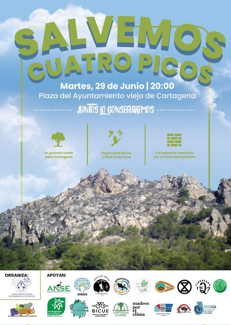 Además, ese mismo día a las ocho de la tarde, han convocado junto a una veintena de asociaciones una concentración en la plaza del Ayuntamiento, para recordar que los vecinos de Cartagena quieren conservar el patrimonio natural de su ciudad.