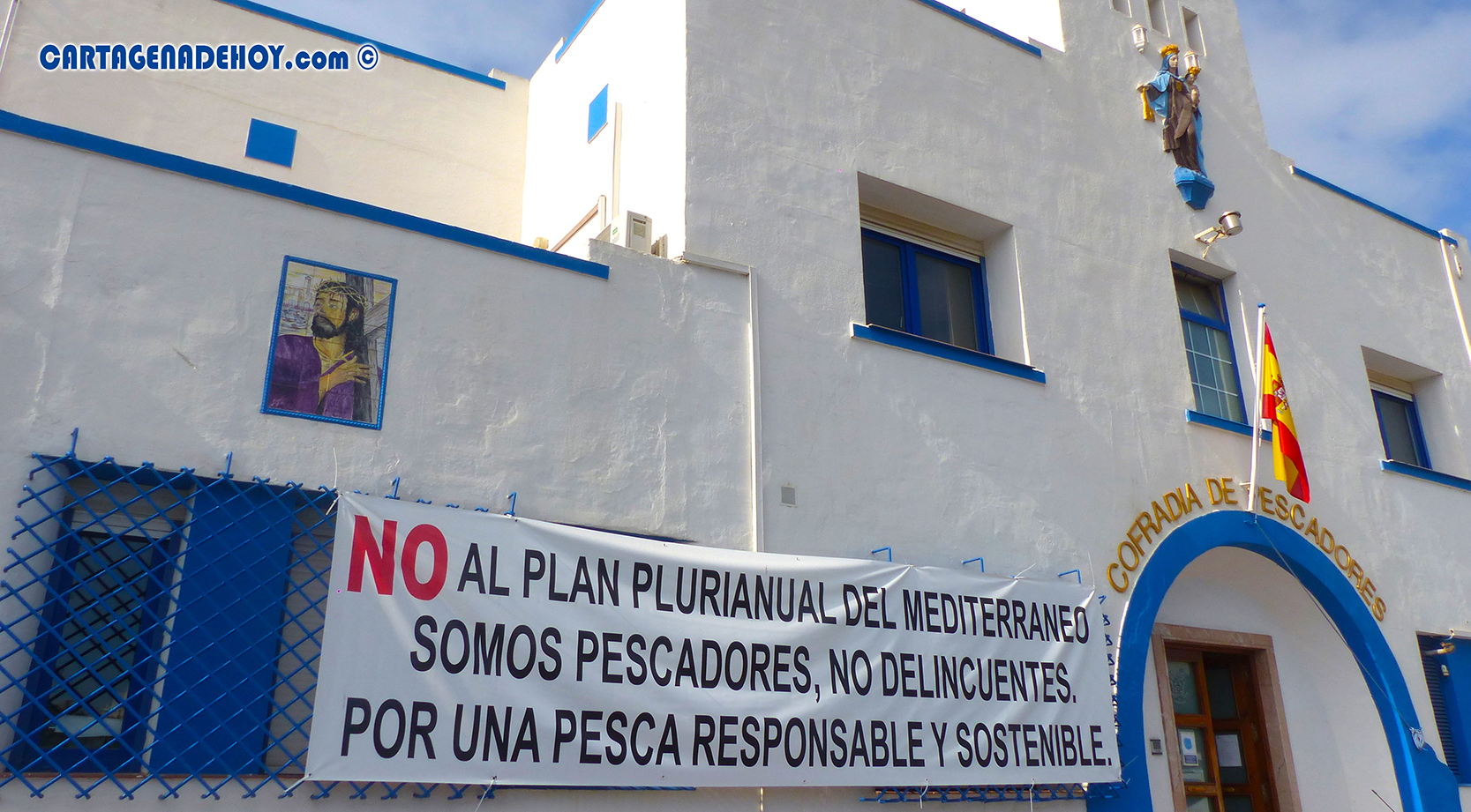 Los pescadores cartageneros tienen colocada de forma permanente una gran pancarta en la Pescadería de Santa Lucía con la que muestran su enfado por los acuerdos entre el gobierno de España y la Unión Europea que han generado una reducción de los trabajos y, consecuentemente, de la producción y de la mano de obra.