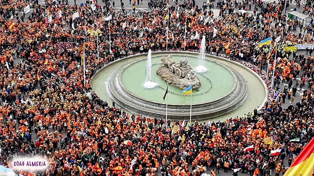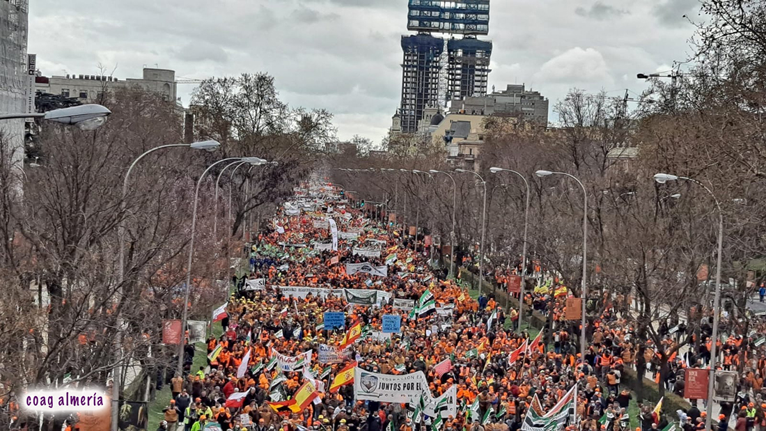 Entre cien mil personas (según datos de la delegación del Gobierno) y cuatrocientas mil (según los organizadores) personas del sector primario (agricultura, ganadería y pesca, entre otros) se han presentado hoy en Madrid para, en una manifestación histórica, reclamar respeto y futuro bajo el lema ‘20M en defensa del mundo rural’. Desde la Región de Murcia han acudido más de un centenar de autocares repletos, además de vehículos particulares.