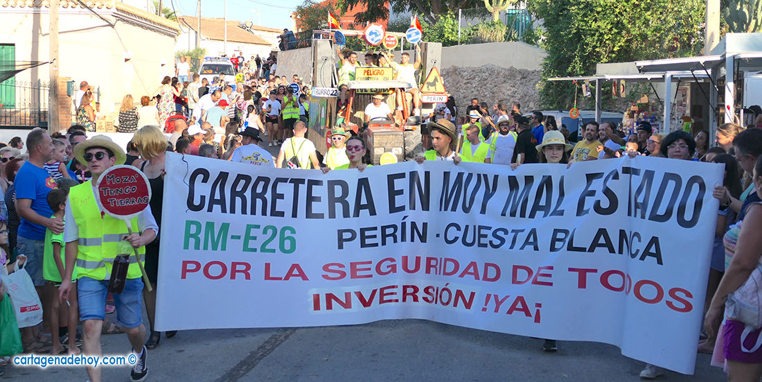Uno de los grupos de jóvenes del desfile del sábado en las Fiestas de Perín desplegó una gran pancarta para reclamar al gobierno de la Comunidad Autónoma de la Región de Murcia el arreglo de la RM-E26 que une La Corona de Perín con Cuesta Blanca, demanda que los vecinos vienen efectuando desde hace tiempo.
