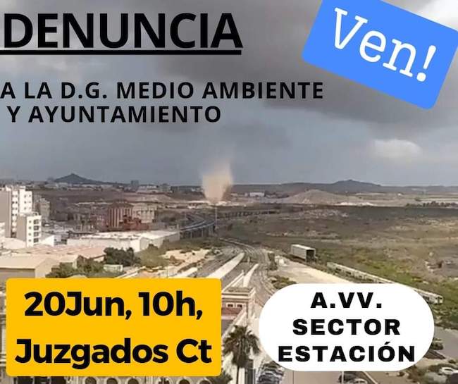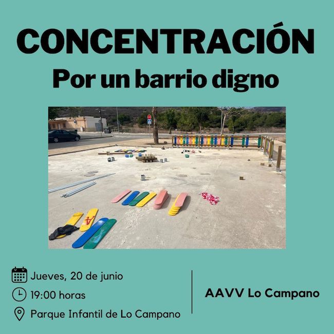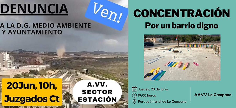 La Asociación de Vecinos del Sector Estación convoca a la ciudadanía en la puerta del Palacio de Justicia a las 10 horas para la presentación de una denuncia a la dirección general de Medio Ambiente y al Ayuntamiento de Cartagena por el asunto de la descontaminación de los terrenos que ocuparon industrias décadas atrás. Por su parte, el colectivo vecinal de Lo Campano convoca una concentración para pedir un barrio digno tras conocer que el nuevo parque infantil se crea con material deteriorado.