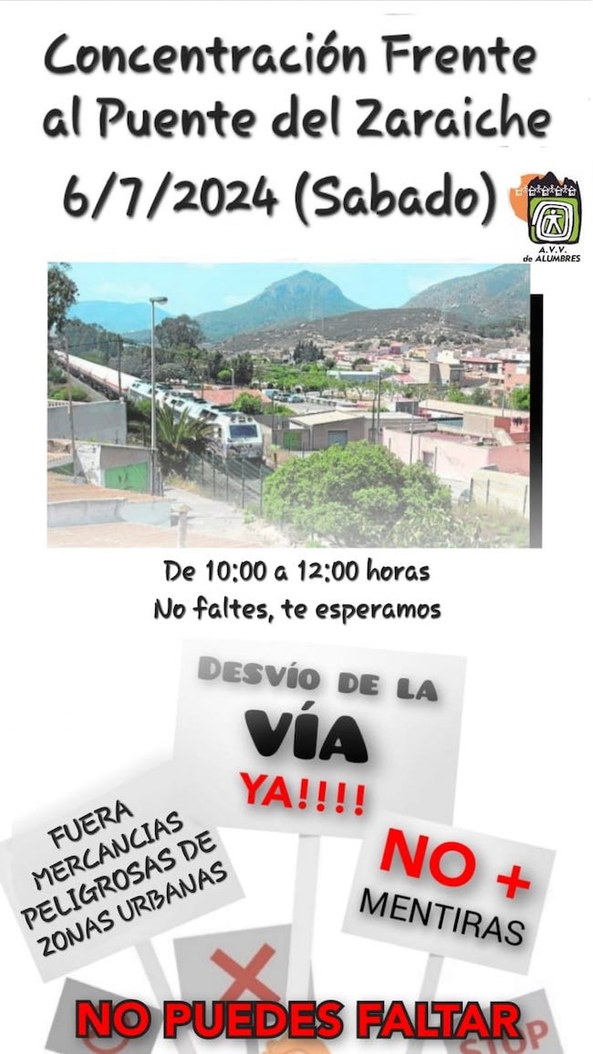 La concentración para reclamar al Estado un nuevo trazado del paso de tren de mercancías de Escombreras que evite su paso por entre las casas del pueblo vuelve a celebrarse este sábado, de 10 a 12 horas, frente al puente de Zaraiche.