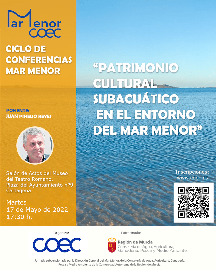 La conferencia “Patrimonio Cultural Subacuático en el Entorno del Mar Menor” es la segunda jornada del ‘Ciclo de Conferencias Mar Menor’, organizado por COEC y que contará con diferentes ponencias sobre el Mar Menor a lo largo del presente año. Estas jornadas están subvencionadas por la Dirección General del Mar Menor, de la Consejería de Agua, Agricultura, Ganadería, Pesca y Medio Ambiente de la Comunidad Autónoma de la Región de Murcia.