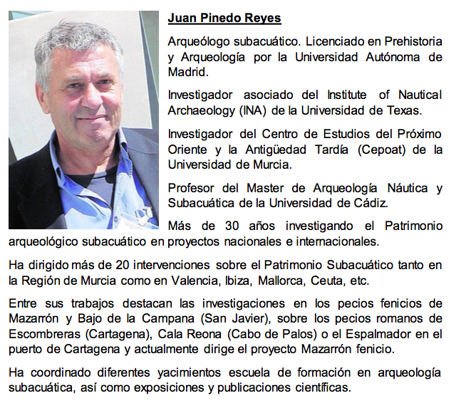 El encargado de realizar la conferencia será el arqueólogo Juan Pinedo Reyes, quien suma más de 30 años de investigación de Patrimonio arqueológico subacuático en diferentes proyectos nacionales e internacionales. En esta jornada, se darán a conocer los más de 25 yacimientos que se encuentran bajo el mar en todo el cordón litoral y que son el resultado de un intenso tráfico marítimo a lo largo de la historia por la costa.
