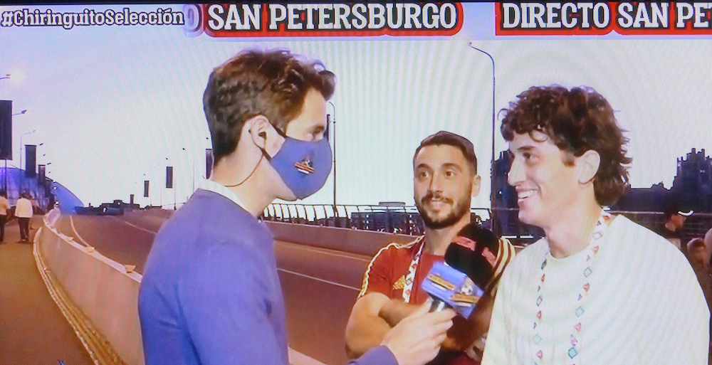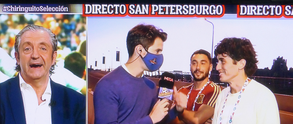 El espacio deportivo de televisión de ‘El chiringuito de jugones’ que dirige Josep Pedrerol conectó en directo con la ciudad rusa, donde su enviado especial entrevistó a dos aficionados que habían estado en el estadio donde España había eliminado a Suiza en la Eurocopa de fútbol. Eran Cristian y Fernando, quienes dijeron que habían viajado desde Cartagena tras ganar un concurso de Instagram.