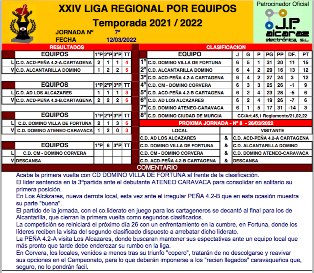 El primer equipo cartagenero de la XXIV Liga regional de dominó por equipos pierde ante Alcantarilla (4-5) y deja el primer puesto de la clasificación, mientras que el conjunto B ganó en Los Alcázares (3-6).