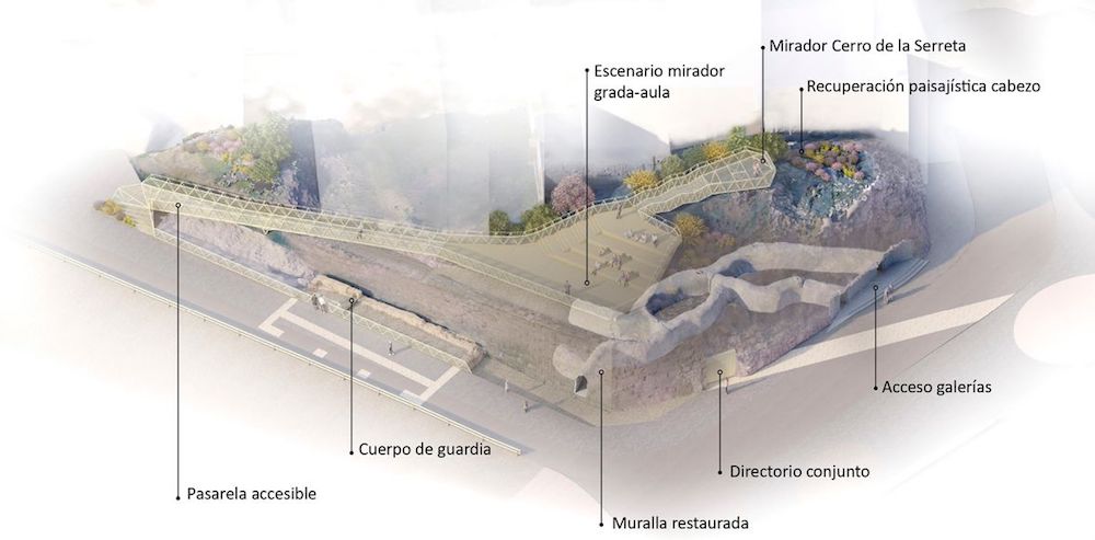 El proyecto de remodelación incluye la puesta en valor del conjunto histórico formado por el Baluarte de Berwick de la muralla de Felipe V, el cuerpo de Guardia Cristina y el cerro de la Serreta, así como las galerías que se usaron como refugio durante la Guerra Civil.