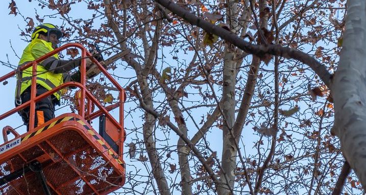 Para llevar a cabo estas labores, se utiliza una grúa con un brazo articulado de 26 metros de longitud y un camión para depositar los restos de poda.