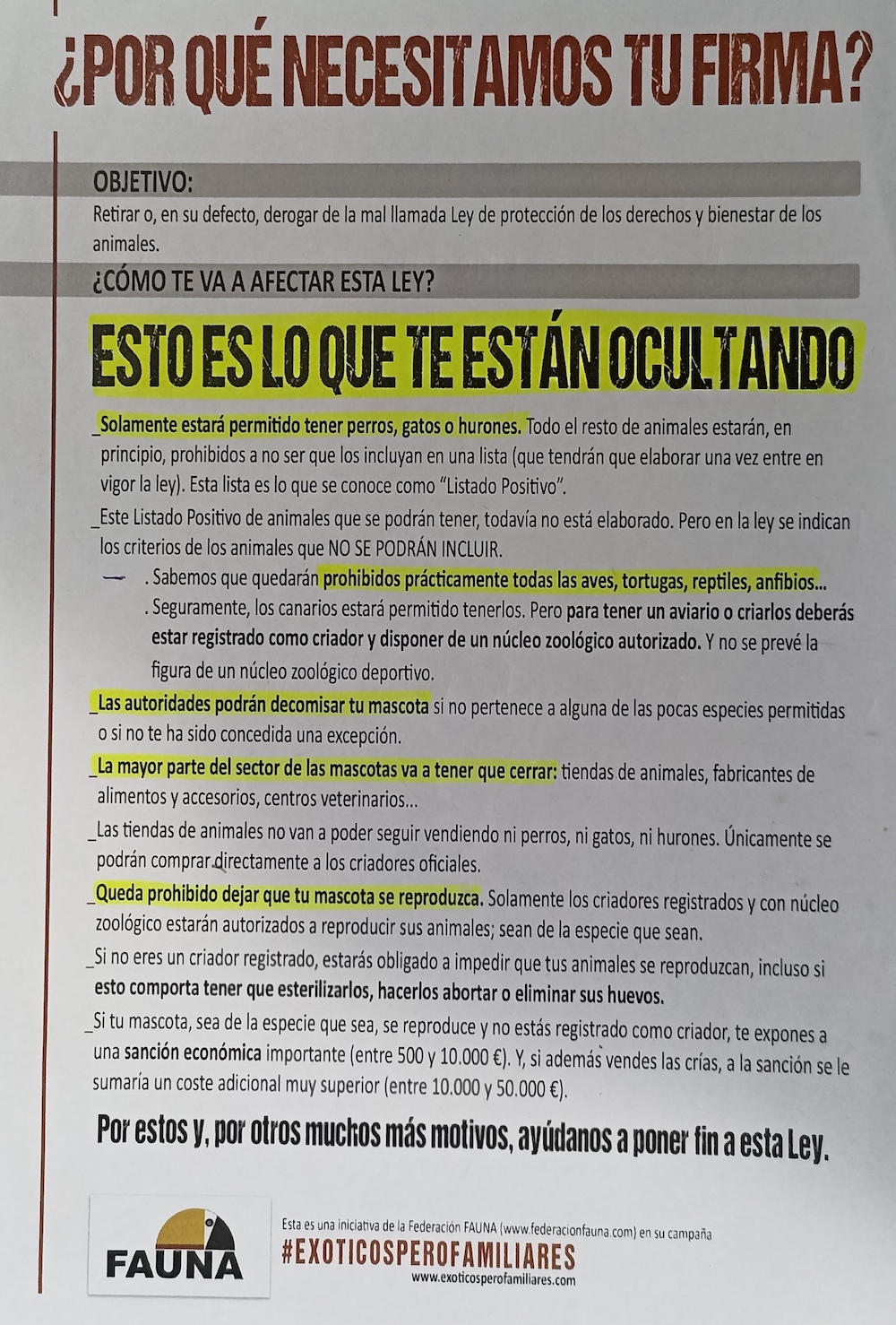 La Federación Fauna ha iniciado una campaña de recogida de firmas a la que se han sumado bastantes establecimientos de Cartagena y su comarca dedicados a servicios o venta de productos para mascotas. Se pide que la ley se retirada o derogada al entender que perjudica a la tenencia de mascotas que no sean perros, gatos o hurones, además de entender que esta nueva normativa generará que negocios del gremio (tiendas de animales, fabricantes de alimentos, centros veterinarios…) cierre en un futuro próximo.