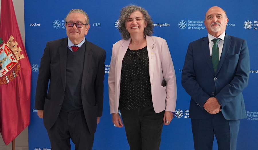 En la imagen, de izquierda a derecha, se observa al exrector de la Universidad de Alicante, Andrés Pedreño, a la rectora de la UPCT y al director general de ATU, Eduardo Ordoñez.
