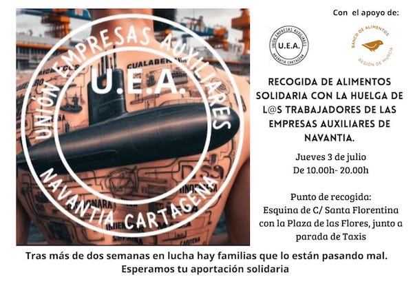La iniciativa, que tiene como objetivo ayudar a las familias tras dos semanas de lucha, cuenta con el apoyo de la Unión de Empresas Auxiliares (UEA) y del Banco de Alimentos de la Región de Murcia de Cartagena. Se llevará a cabo este jueves en un estand que se instalará en la esquina de la calle de Santa Florentina con la plaza de las Flores de la ciudad portuaria.