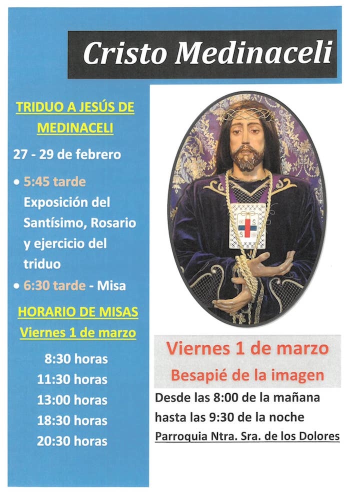 Desde el martes se está celebrando en la iglesia de Nuestra Señora de los Dolores, del barrio del mismo nombre de Cartagena Norte, los tres días de honores a la imagen de Jesús de Medinaceli, siendo el viernes cuando tenga lugar el tradicional besapié, estando la parroquia abierta de 8 a 21.30 horas.