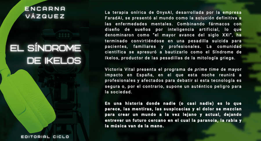 Encarna Vázquez presenta con El Síndrome de Ikelos su primera novela, donde nadie (o casi nadie) es lo que parece. Las mentiras, las suspicacias y el dolor se mezclan para crear un mundo a la vez lejano y actual, dejando entrever un futuro cercano en el cual la paranoia, la rabia y la música van de la mano.